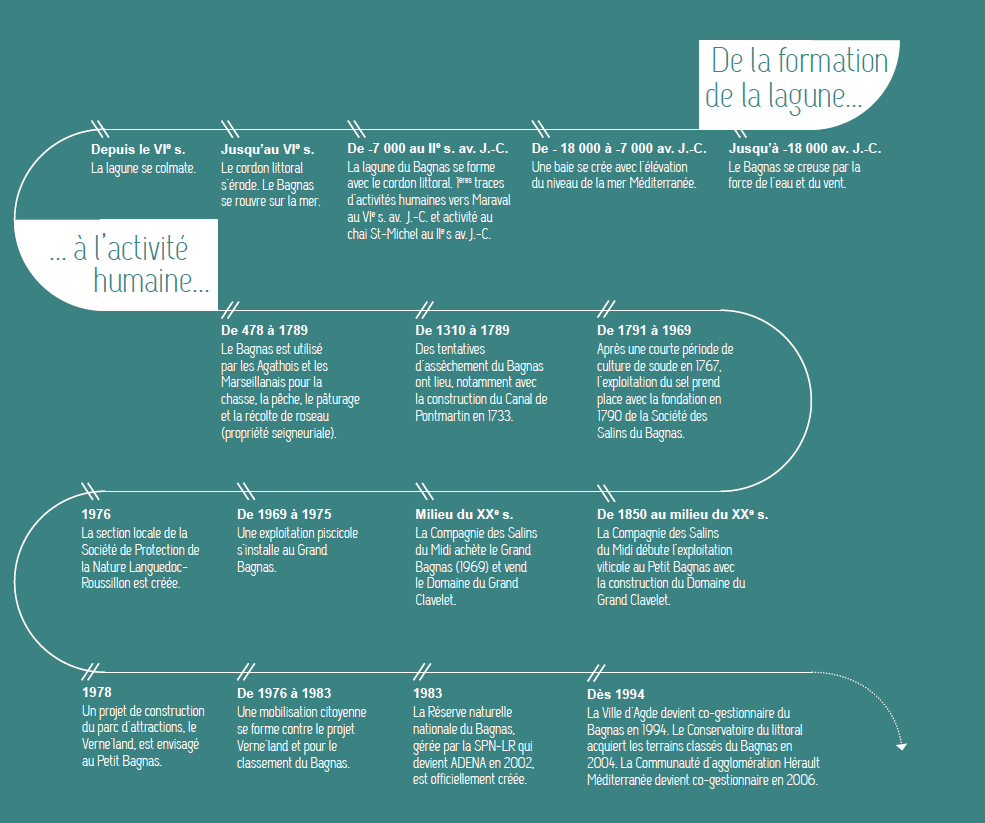 Jusqu’à la révolution française : Utilisation des terrains par les habitants d’Agde et de Marseillan pour la chasse, la pêche, le pâturage et la récolte des roseaux. Tentative d’assèchement du Bagnas par les seigneurs et évêques propriétaires des terres par le creusement du Canal Pont Martin en 1733 notamment.